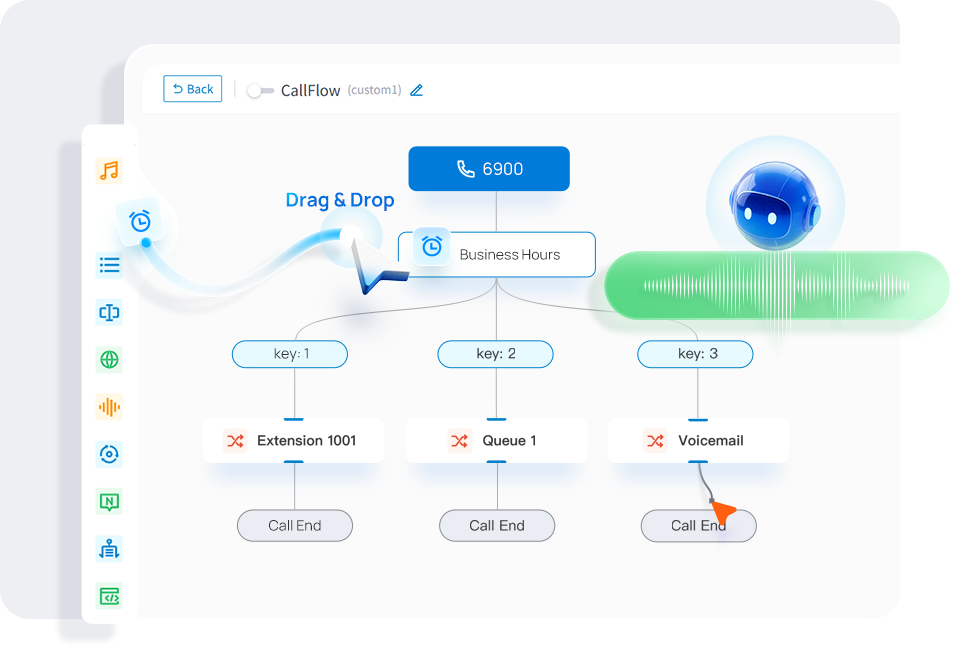 Crea e gestisci flussi di chiamata personalizzati con un designer visivo drag-and-drop.